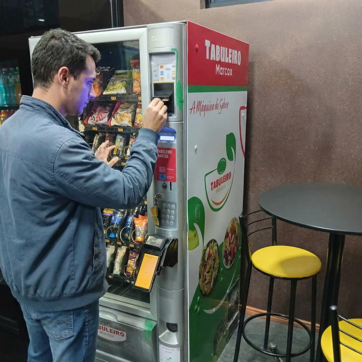 Maquinas Tabuleiro, proporcionam o melhor serviço com foco em alimentação saudável, colaborando desse modo com o meio ambiente. Representa a última palavra em soluções de vendas automáticas através do seu completo pacote de serviços. 100% abastecidas com snacks com apelo saudável. Suas operações para ambientes corporativos, educacionais e hospitalares, prestando um serviço de fornecimento de alimentos por meio de máquinas de autoatendimento.